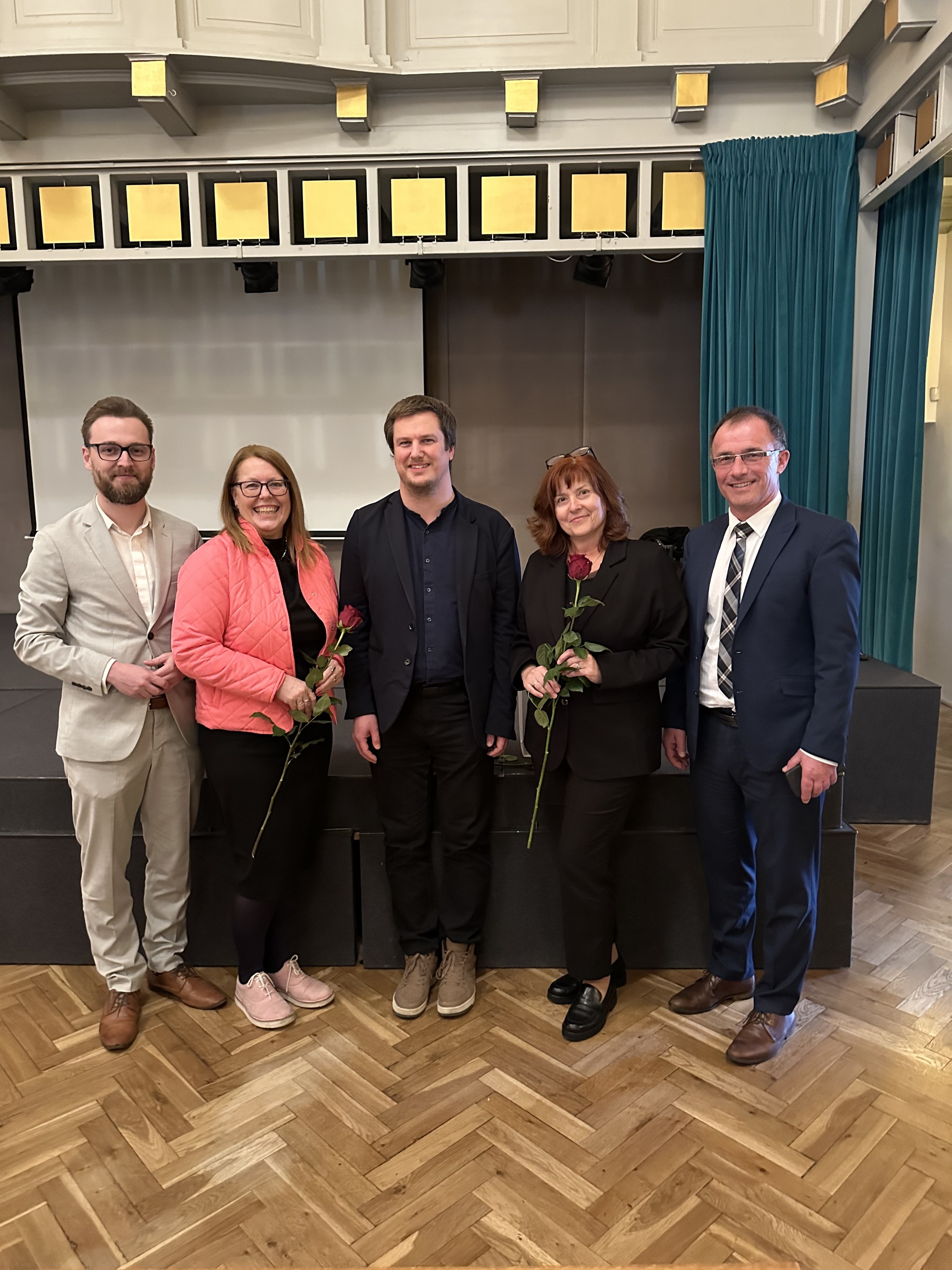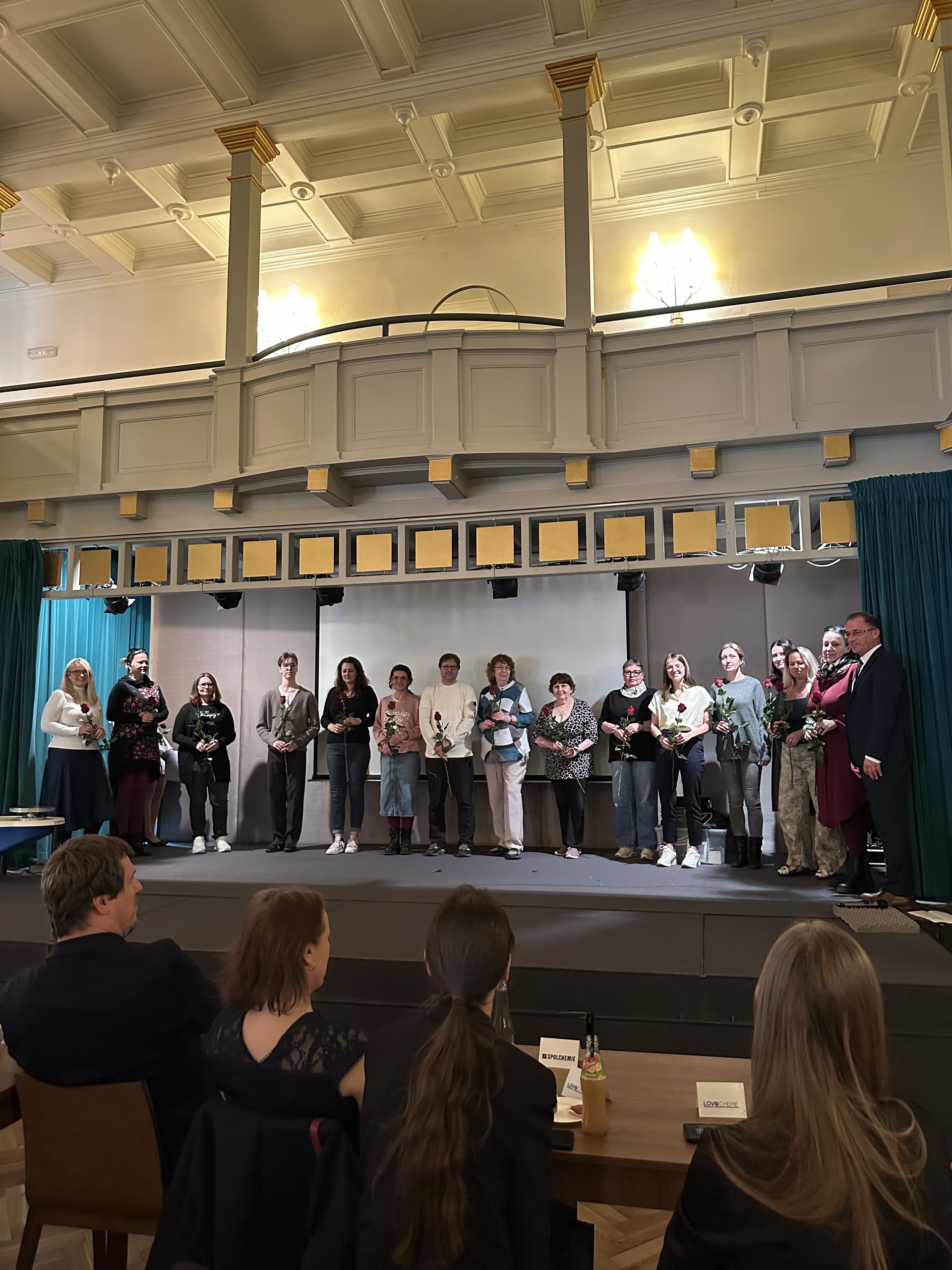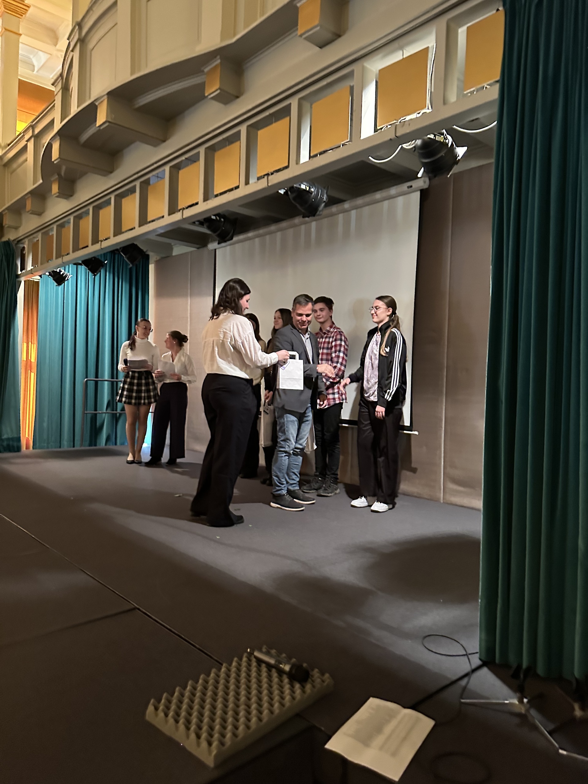 Poděkování patřilo také pedagogům, kteří na pódiu převzali ocenění za obětavou práci v podobě květiny z rukou pana Jiřího Řezníčka, zastupitele a předsedy výboru pro výchovu, vzdělávání a zaměstnanost.